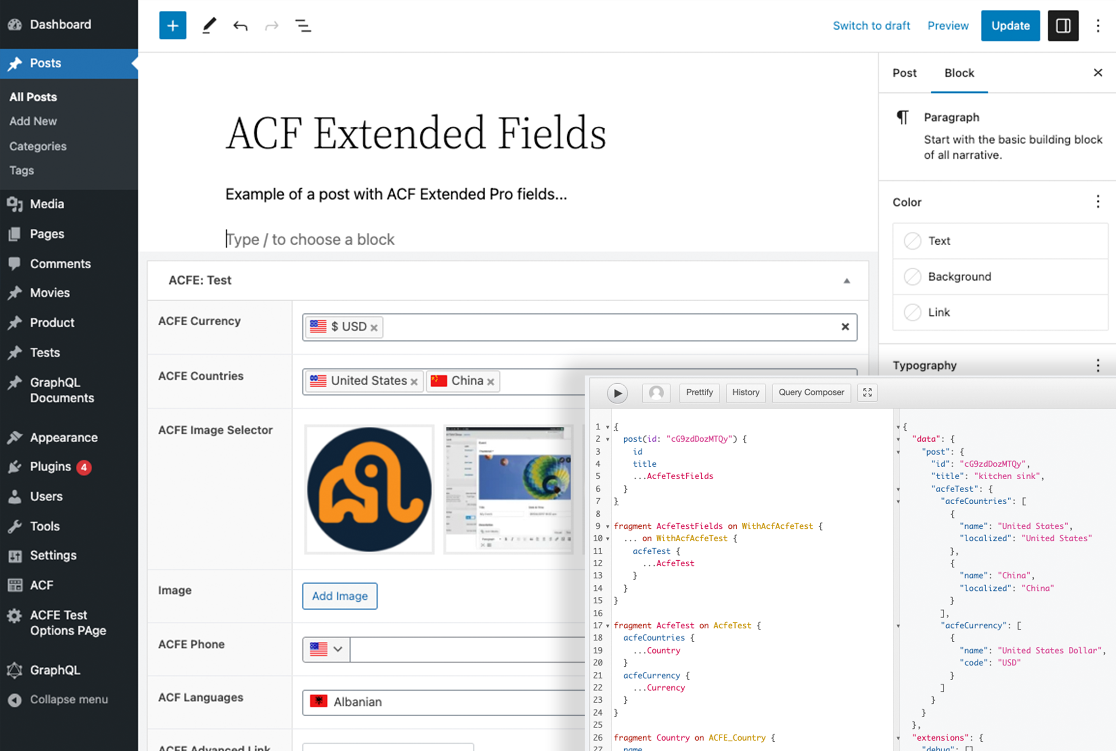 query GetPostWithAcfFields($id: ID!) { nodeByUri(uri: $id) { __typename uri ...on NodeWithTitle { title } ...on WithAcfMyFieldGroup { myFieldGroup { textField numberField } }}Model Your Data with Advanced Custom Fields. Query it with GraphQL