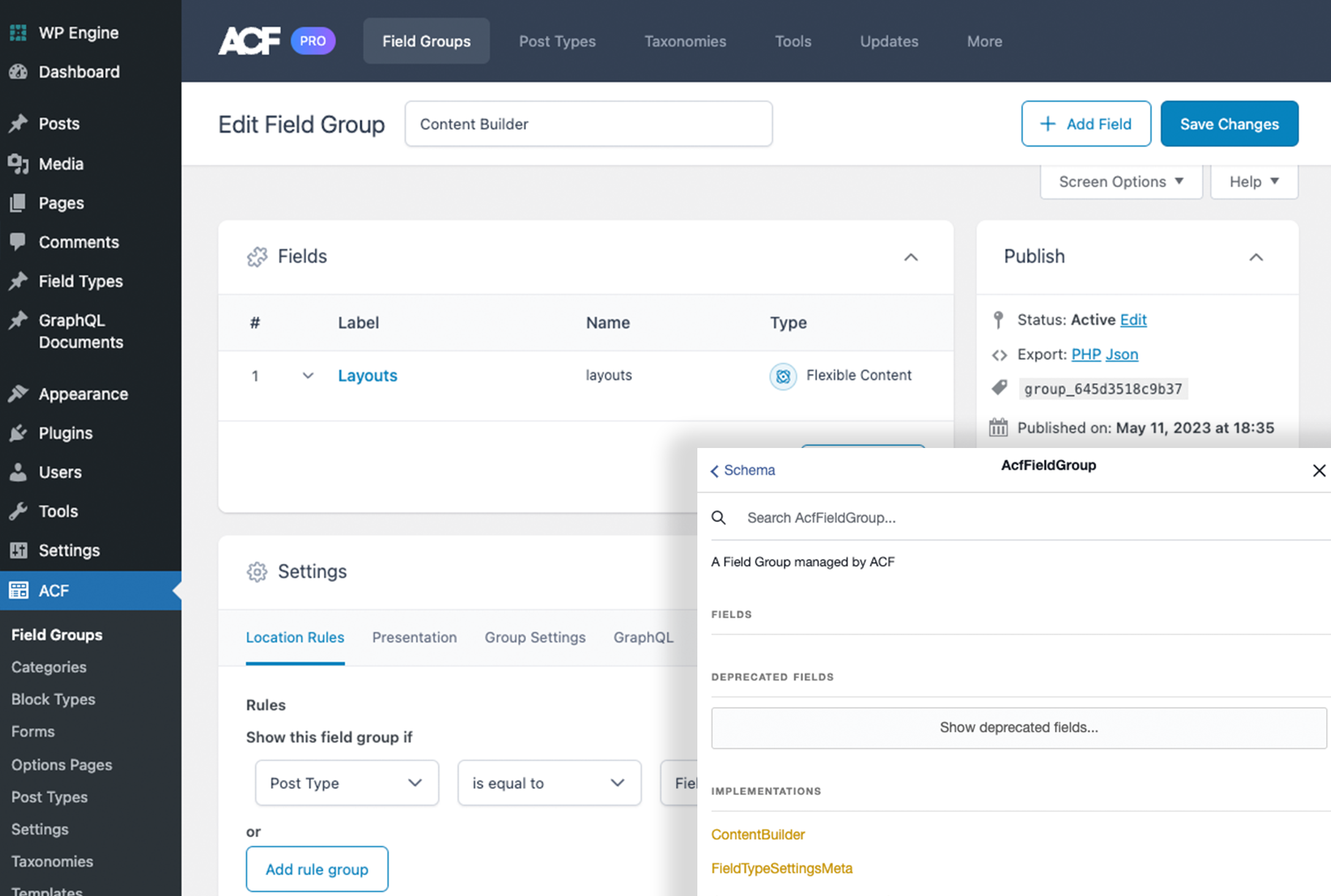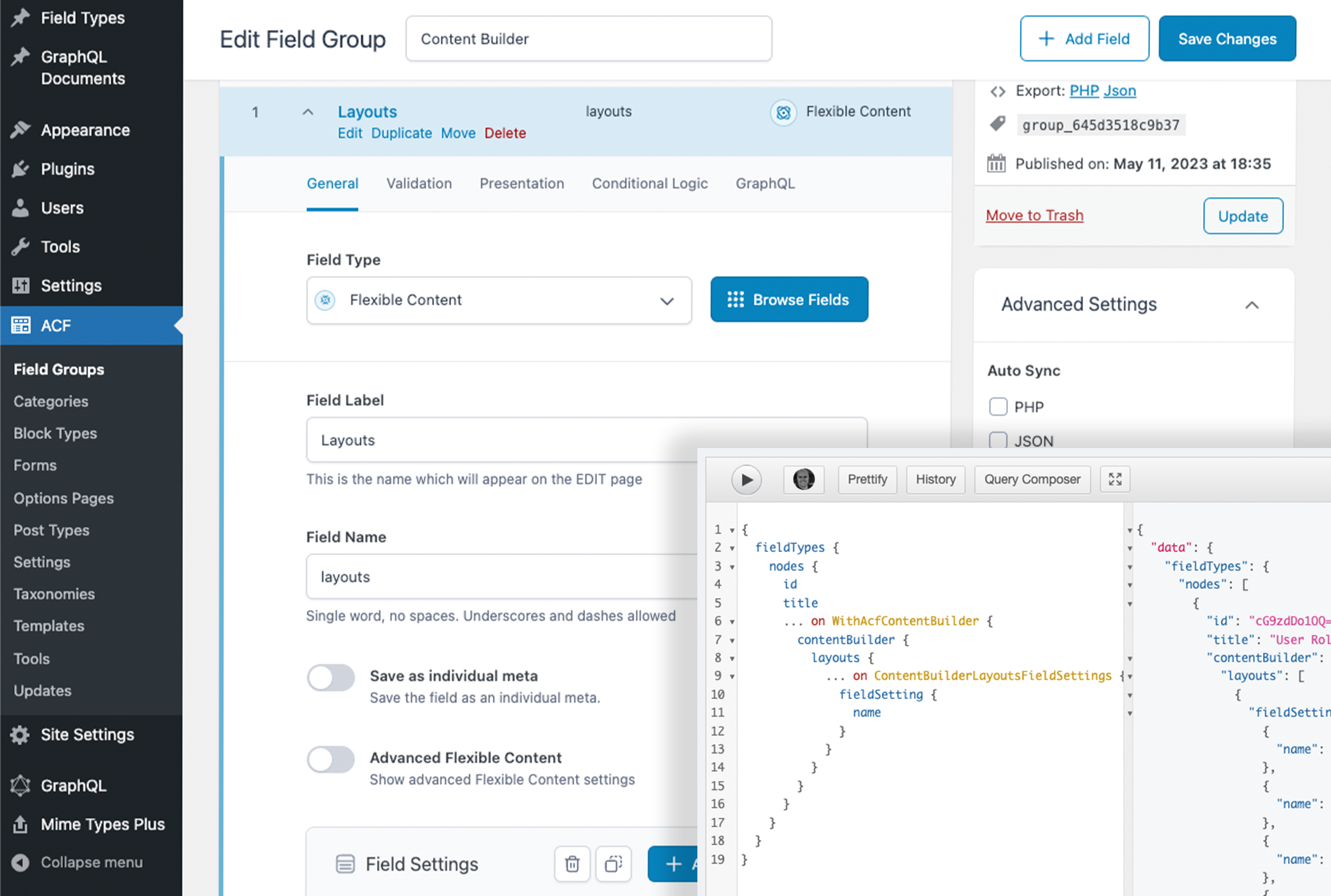 All ACF Field Groups set to "show in graphql" are added to the GraphQL Schema, and share an "AcfFieldGroup" Interface